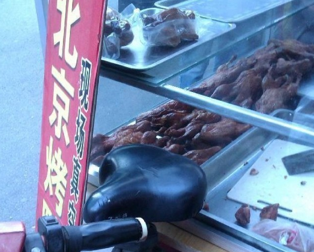 4月8日,記者對北京西站等地的烤鴨市場進行了暗訪。北京西站旁的北蜂窩西路上,一個流動攤販的推車前掛著“北京烤鴨25元/只”的牌子。推車的玻璃柜里陳列著20多個烤好的鴨子,玻璃柜上方還放著已經(jīng)包裝好的“全聚德”和“金聚福”的烤鴨,旁邊還有幾個全聚德烤鴨的包裝袋。