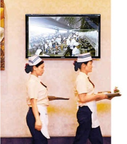 兩名服務(wù)員端著剛剛出鍋的菜肴,走過(guò)實(shí)時(shí)顯示廚房?jī)?nèi)情景的監(jiān)控屏幕