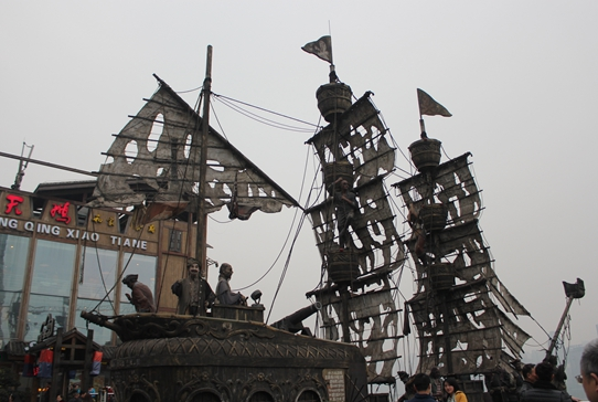 這家火鍋店的負責人告訴記者:“除了火鍋口味保證地道與原汁原味之外,我們玩的就是一個電影噱頭!敝貞c是火鍋的重要發(fā)源地,火鍋又包含著重慶的碼頭文化,而電影《加勒比海盜》為觀眾一直熱追,所以設計團隊就決定用加勒比海盜船的模型來布置餐廳場景,并以“坐在船上吃火鍋”為餐廳主題。