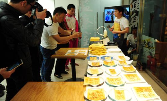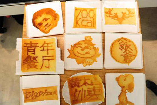 在煎餅上畫個LOGO并不稀奇,在各種蛋糕、餅干、巧克力上打印出LOGO也不稀奇,但利用3D打印技術,打印出來的卻是可以變幻造型和圖案的整個煎餅就十分神奇了!活動現場,只見清華學霸們簡單操作3D煎餅打印機,一個個帶有東方餃子王、很久以前只是家串店、黃記煌等多家餐飲企業logo的煎餅,以平均3分鐘的速度快速誕生。這種新奇有趣的3D打印煎餅,在現場不僅搶足了風頭,還引發圍觀群眾爭相體驗。