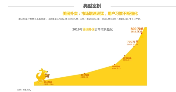 報(bào)告指出,外賣O2O市場增速迅猛,用戶習(xí)慣不斷強(qiáng)化。以美團(tuán)外賣為例,通過美團(tuán)外賣APP、美團(tuán)、大眾點(diǎn)評、手機(jī)QQ、微信等多元化的入口引流,截至今年9月,月活躍用戶數(shù)高達(dá)8,018萬人。目前,美團(tuán)外賣的日訂單量更是超過了800萬單,其中,日訂單量從500萬單到600萬單、600萬單到700萬單、700萬單到800萬單的增長都只用了1個(gè)月左右。