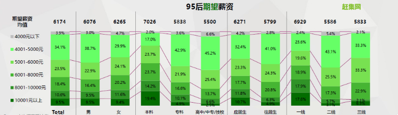 趕集網調研數據顯示,2018年95后應屆畢業生期望薪資的均值為6174元,其中9.5%的畢業生希望月薪超過10000元,而40%的畢業生對月薪的期望都超過8000元。與往屆生相比,應屆生對薪資的期望更高。然而,95后應屆畢業生的實際薪資平均值為5429元,80%的畢業生實際薪資在8000元以下,這說明理想與現實仍然存在一定差距。