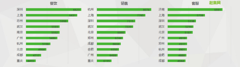 從薪資方面來看,深圳餐飲企業為95后應屆畢業生提供的平均薪資水平最高,平均達6623元。其次是上海和蘇州分別為6431元和5998元。銷售類人才的薪資水平方面,杭州、上海、深圳排在前三位,分別為8074元、7795元和7315元。客服類人才薪資,濟南以6591元明顯高于其他城市,上海和深圳以5759元和5338元分列第二、第三位。一線城市的客服類人才需求量雖然逐年下降,但是因為當地薪資水平的差異,一線城市客服類薪資仍保持在較高水平。城市與薪酬,一直是求職者求職的的主要考量因素。做好職業規劃,根據職業目標來選擇相應的城市與崗位,十分重要。
