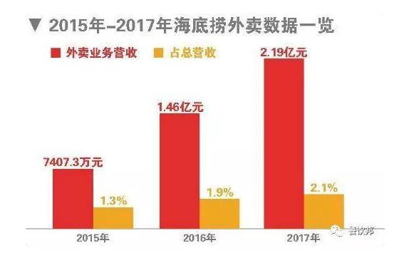 公開資料顯示,早在2010年6月,海底撈“Hi撈送”成立,成為首家推出外賣業務的火鍋餐廳,至今在國內40余個城市推出外賣業務,2017年海底撈外賣業務收入為2億元。