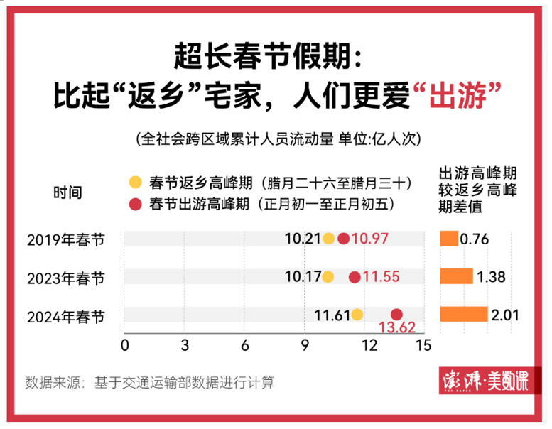 澎湃新聞基于交通運輸部公布的每日全社會跨區(qū)域人員流動量數(shù)據(jù)進行計算,發(fā)現(xiàn)和2019年、2023年同期相比,今年春節(jié)出游高峰期的人員流動更頻繁。