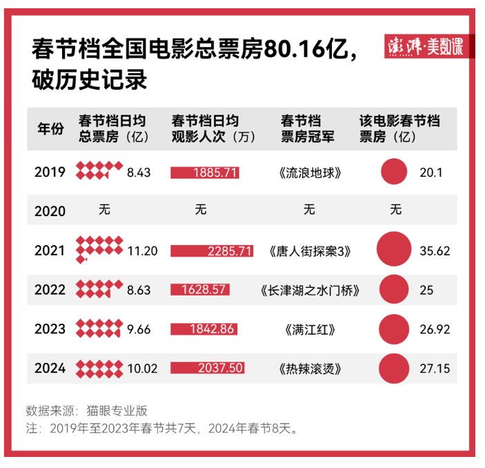 國家電影局2月18日發(fā)布的數(shù)據(jù)顯示,2024年國內(nèi)春節(jié)檔電影票房達80.16億元,創(chuàng)造了新的春節(jié)檔票房紀錄,觀影人次為1.63億。